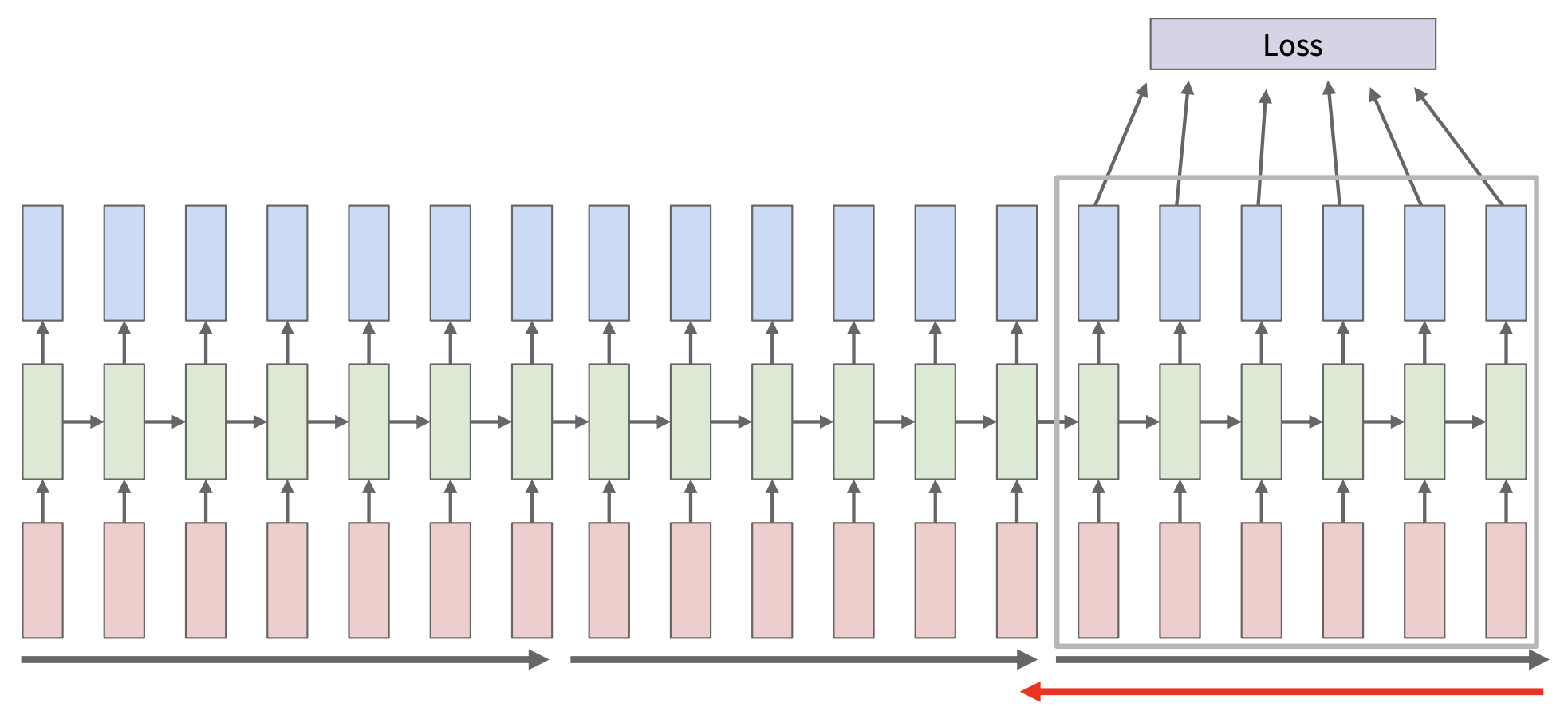 - 永远向前传递隐含状态,但仅在较少的步骤中进行反向传播