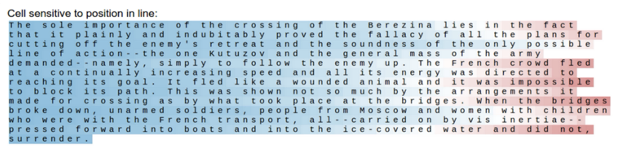 我们将展开后的 RNN 中的隐含状态看作神经网络上的一个个细胞。我们希望能找到那些可解释的(interpretable) 细胞,即有明确功能和目的的细胞,比如说: