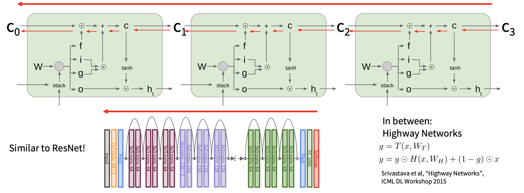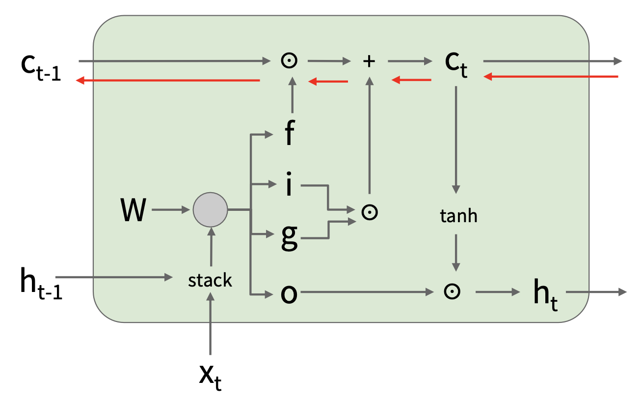 从 \(c_t\) 到 \(c_{t-1}\) 的反向传播仅做和 \(f\) 的逐元素乘法,而不是和 \(W\) 的矩阵乘法。