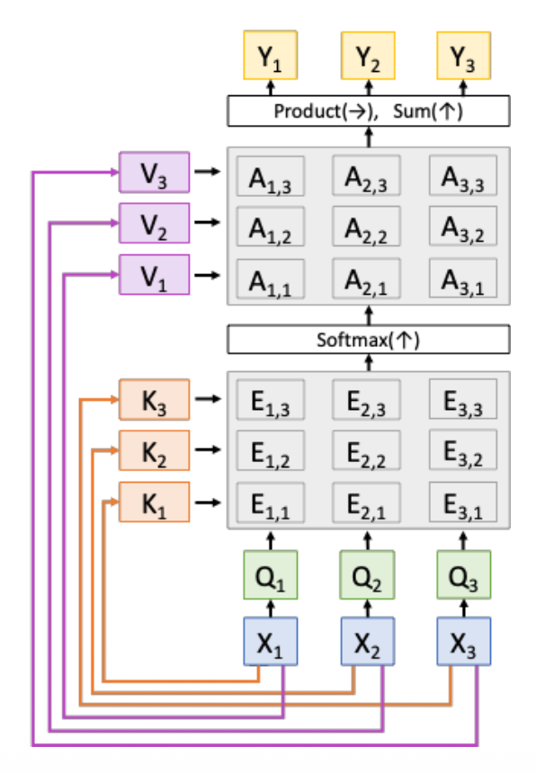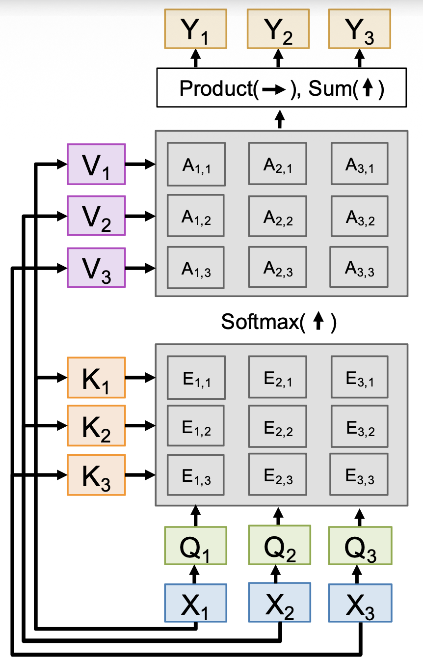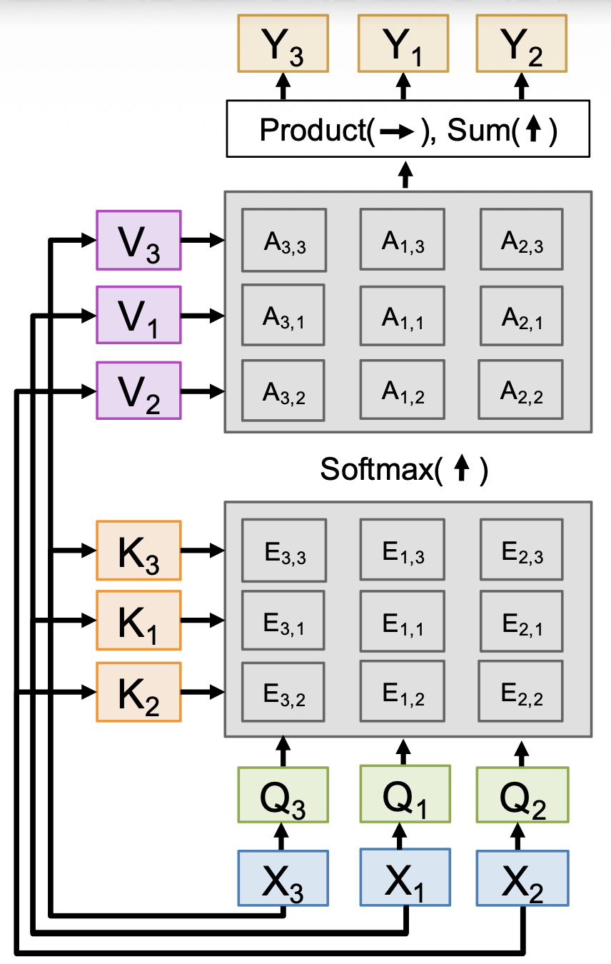 • 输出向量则变为基于的计算:\(Y = AX\)\(N_Q \times D_X\),其中 \(Y_i \sum_i A_{ij} X_j\)