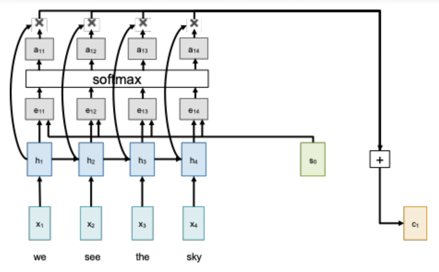 • 根据初始解码器状态 \(s_0\) 和编码器的隐含状态,计算每个隐含状态对应的对齐分数(alignment score)(标量)