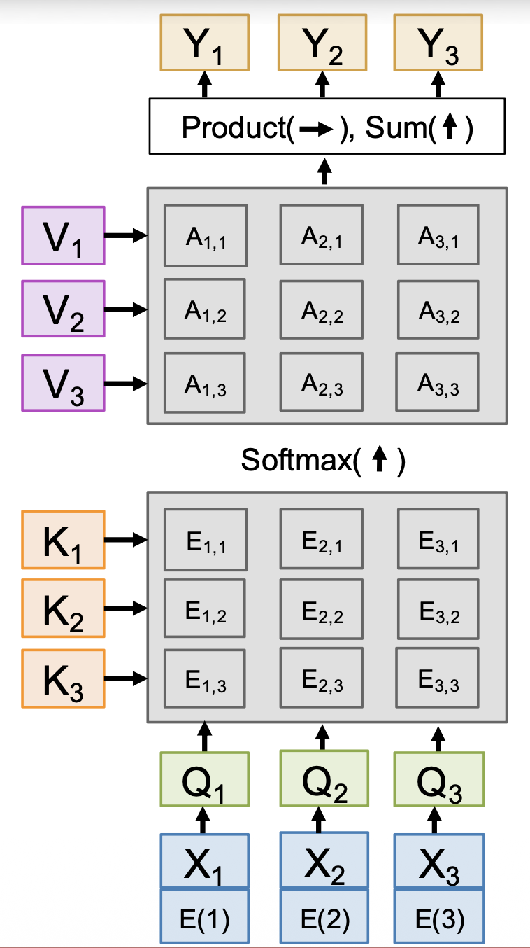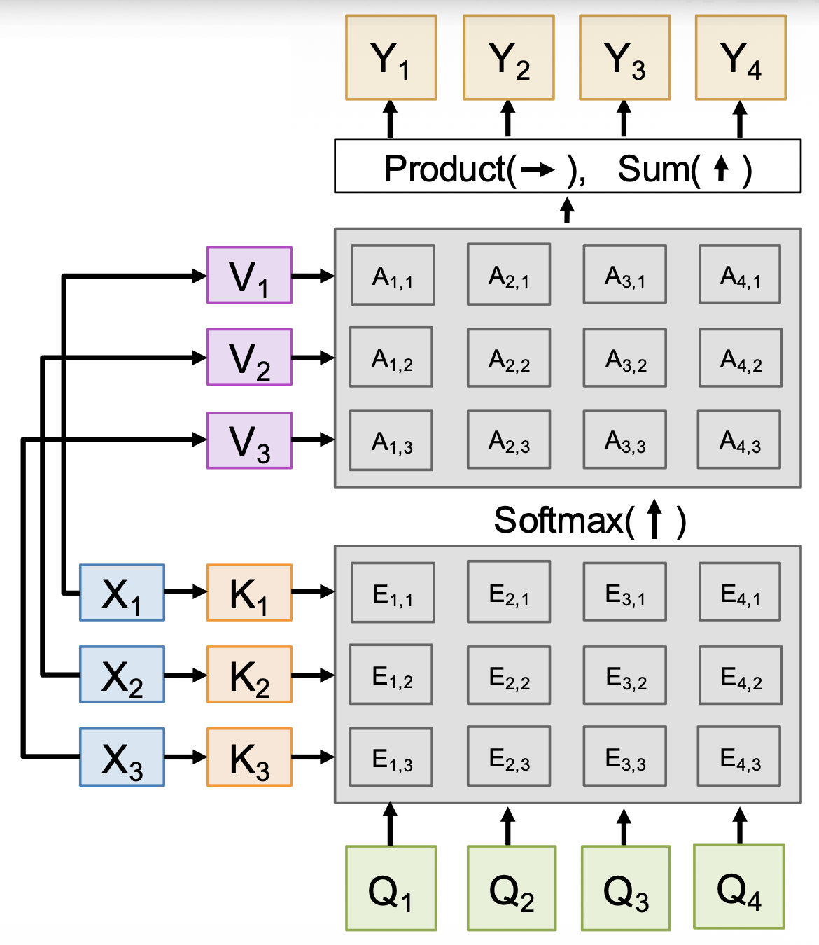 • 相似度变为基于的计算:\(E = QK^T / \sqrt{D_Q}\)\(N_Q \times N_X\),其中 \(E_{ij} = Q_i \cdot K_j / \sqrt{D_X}\)