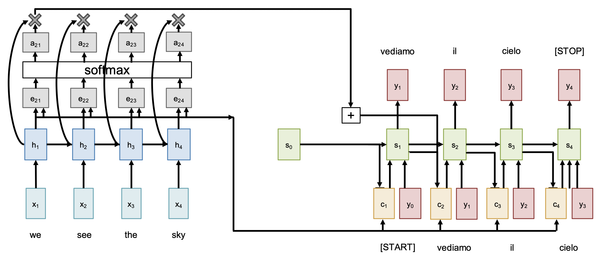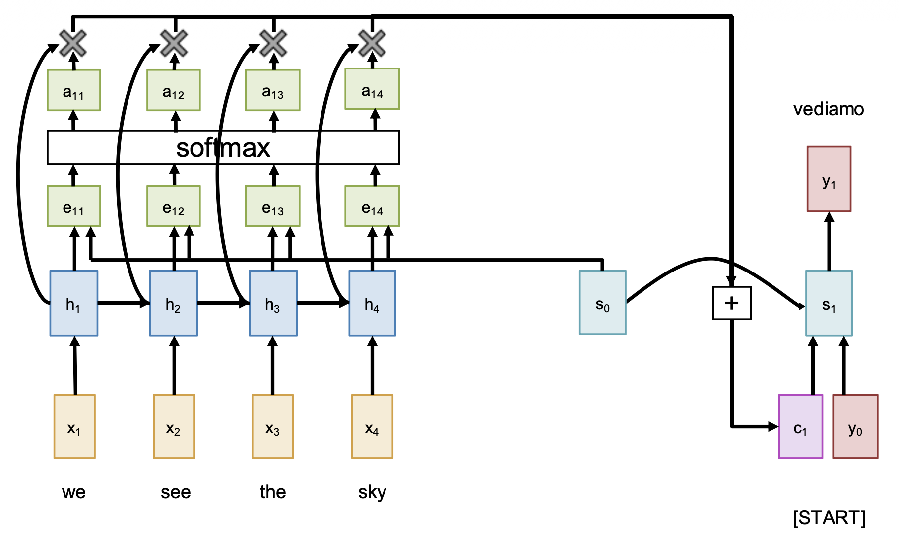 直觉上看,上下文向量关注的是输入序列的相关部分。比如意大利语 "vediamo" = 英语 "we see",所以可能 \(a_{11} = a_{12} = 0.45, a_{13} = a_{14} = 0.05\)