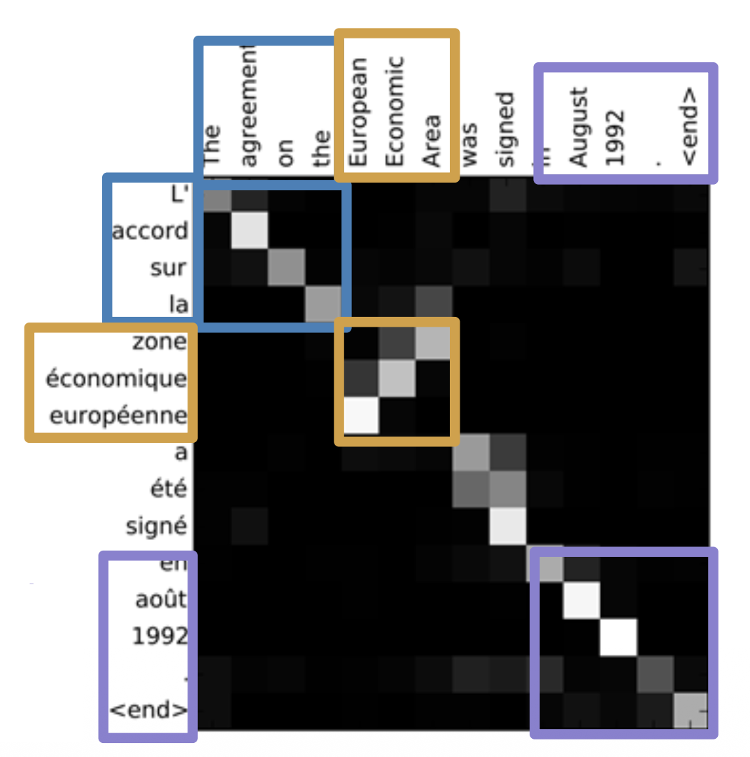 • 蓝色和紫色部分:对角注意意味着词语按顺序对应