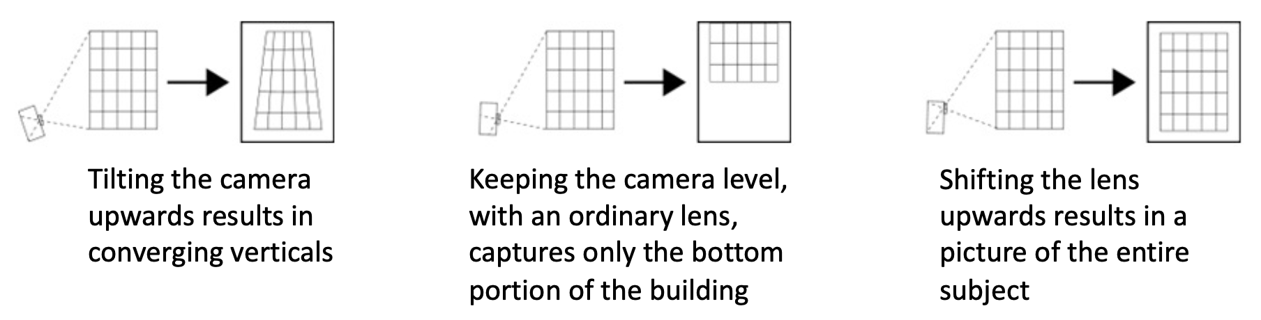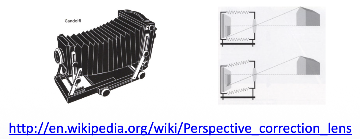 我们的预期是得到像右图那样的效果,那么该如何实现呢?解决方案就是使用移轴相机(view camera)(镜头相对于胶片移动