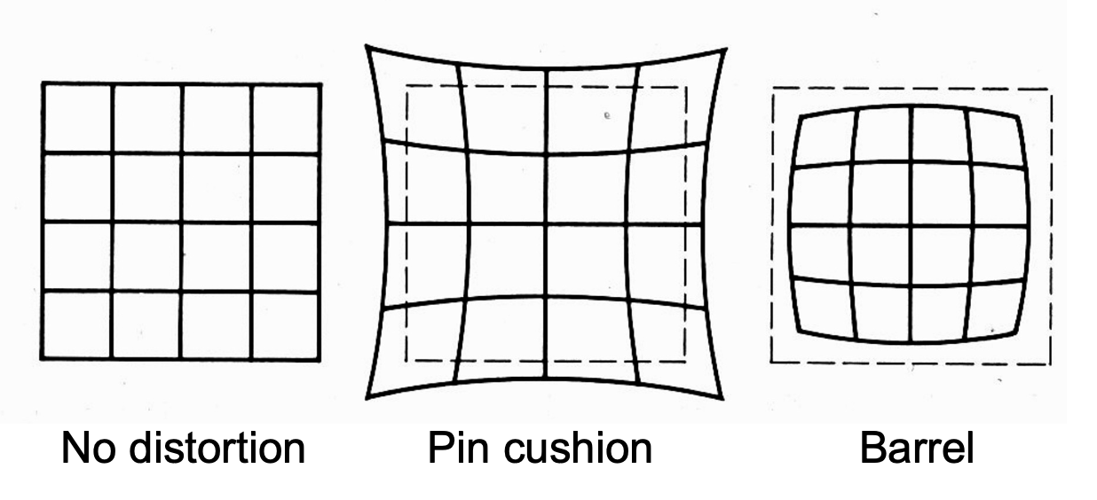 - 桶形(barrel) 畸变 <- 广角镜头