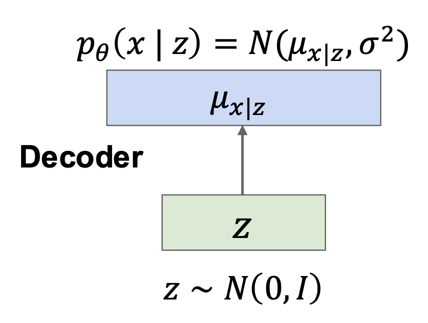 - \(p_\theta (x|z) = N(\mu_{x|z}, \sigma^2)\) -> \(\log p_\theta (x|z) = -\dfrac{1}{2\sigma^2} \|x - \mu\|_2^2 + C_2\)