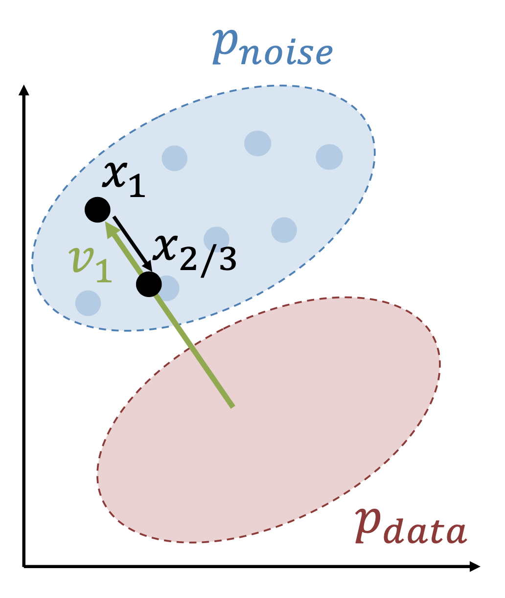 完全噪声(\(t=1\))很容易:最优的 \(v\) 是 \(p_\text{data}\) 的均值