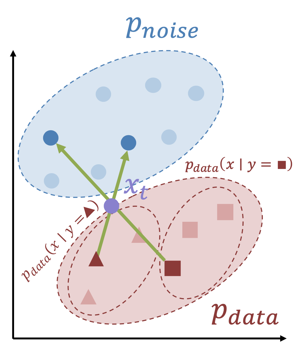 - \(\textcolor{cornflowerblue}{v^{cfg}} = (1 + w)\textcolor{yellowgreen}{v^y} - w \textcolor{orange}{v^{\emptyset}}\) 更多指向 \(p(x | y)\)