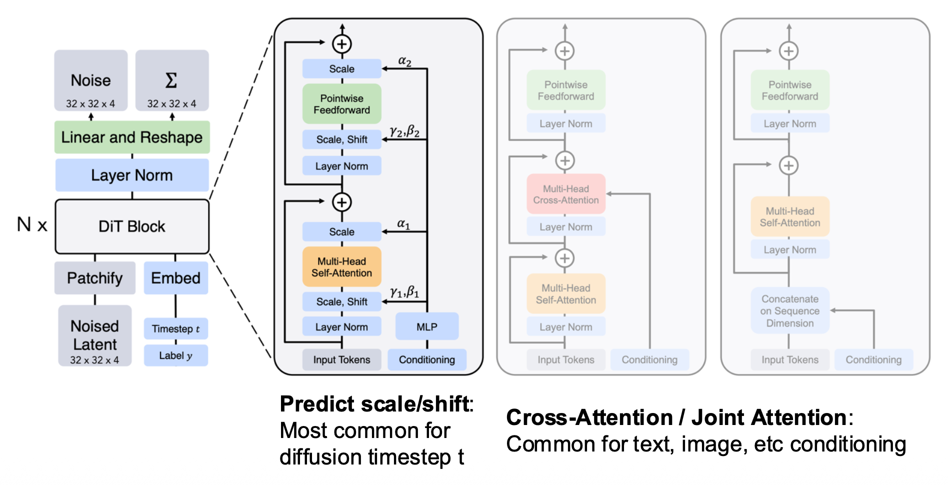 - 交叉注意 / 联合注意:常用于文本、图像等条件
