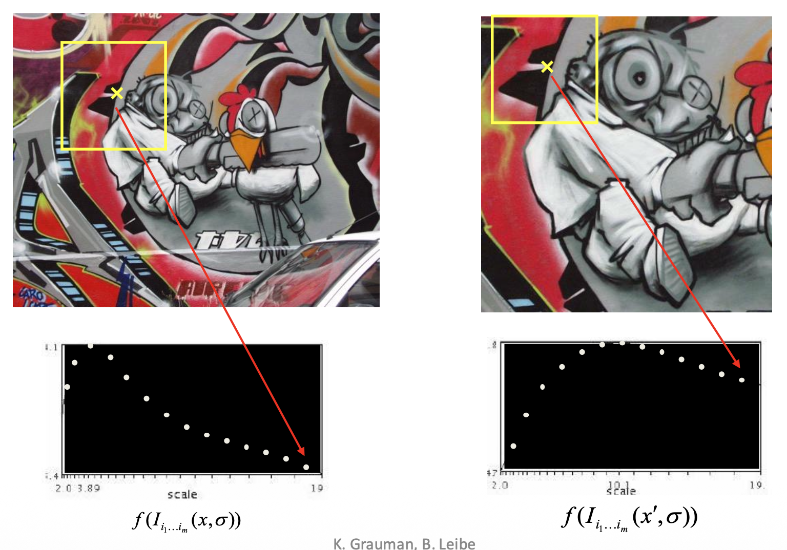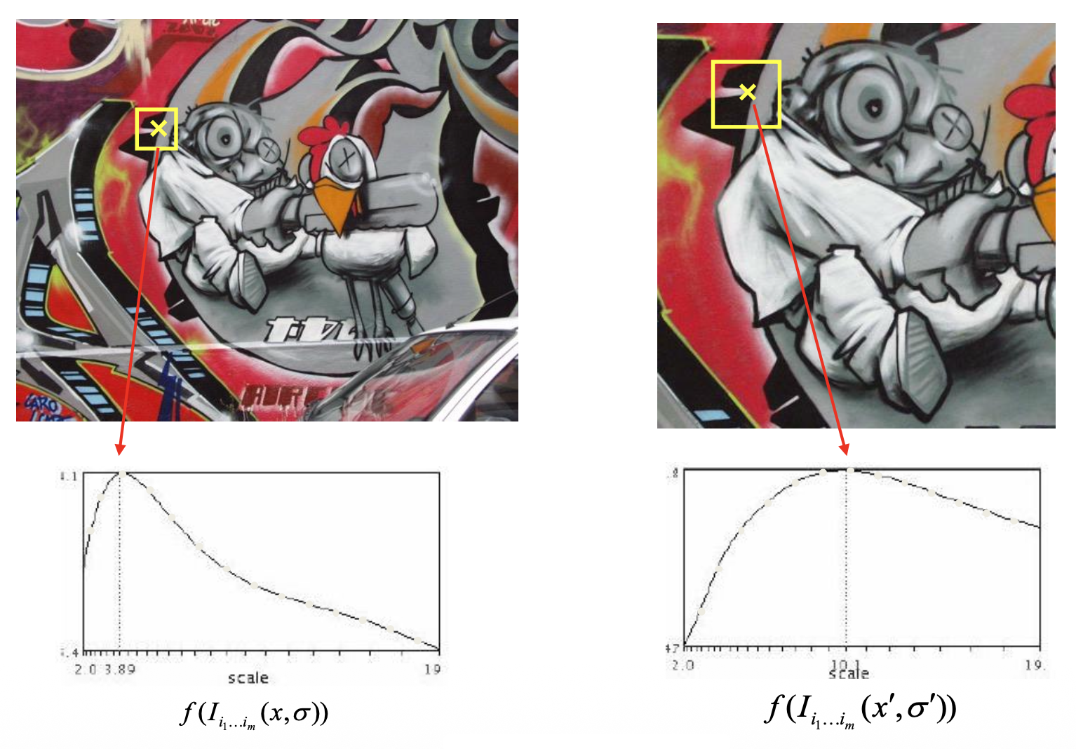 假如要在图像上找角,那么如何确定正确的比例呢?一种解决方案是自动比例选择(automatic scale selection),通过给定的 \(f\) 的局部最大值找出比例: