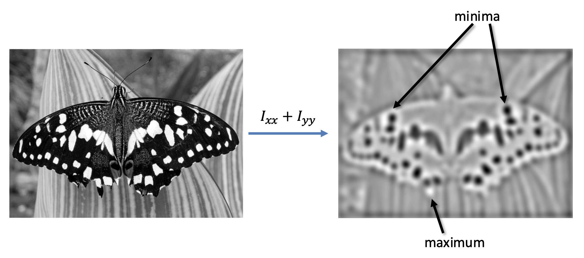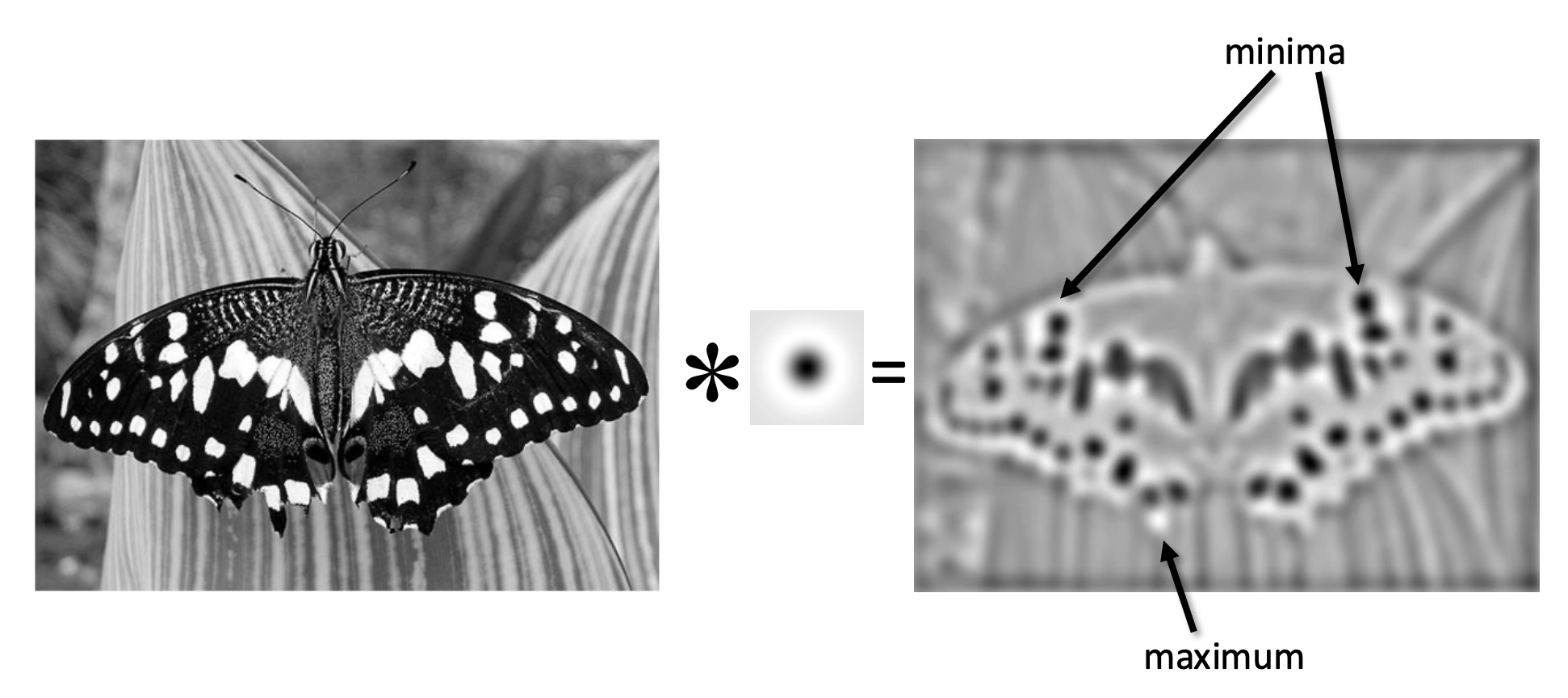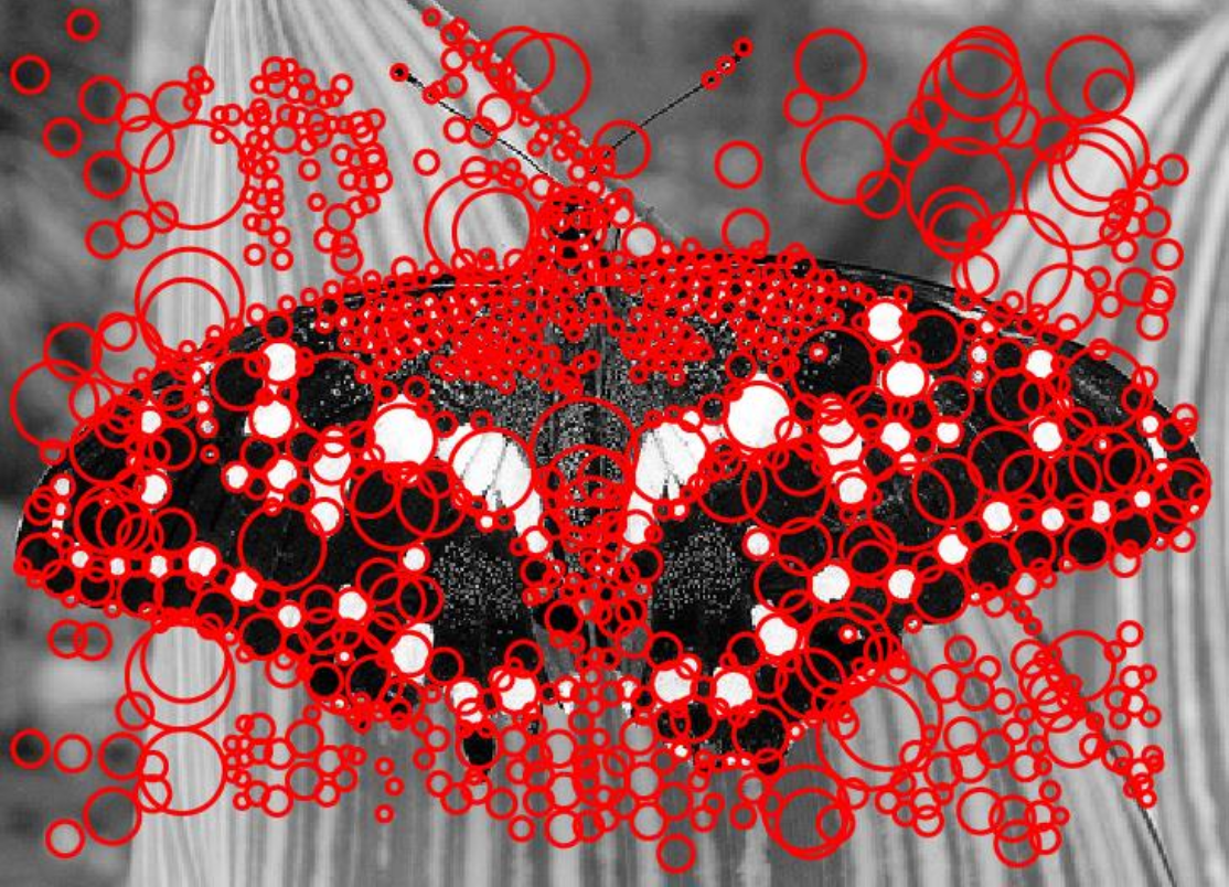斑点(blob) 是一种不错的图像特征。它在图像光强上有着较大的二阶导数值。因此可通过计算图像的拉普拉斯函数,找到其中的最小值和最大值,从而找到斑点。