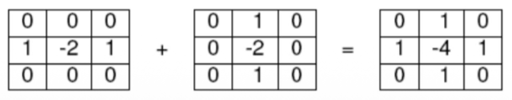 \[ \begin{aligned}&\frac{\partial^{2}f}{\partial x^{2}}=&&f\left(x+1\right)+f\left(x-1\right)-2f\left(x\right)\quad\to\quad\begin{bmatrix}1&-2&1\end{bmatrix} \quad (\text{x kernel}) \\&\frac{\partial^{2}f}{\partial y^{2}}=&&f\left(y+1\right)+f\left(y-1\right)-2f\left(y\right)\quad\to\quad\begin{bmatrix}1\\-2\\1\end{bmatrix} \quad (\text{y kernel})\end{aligned} \]