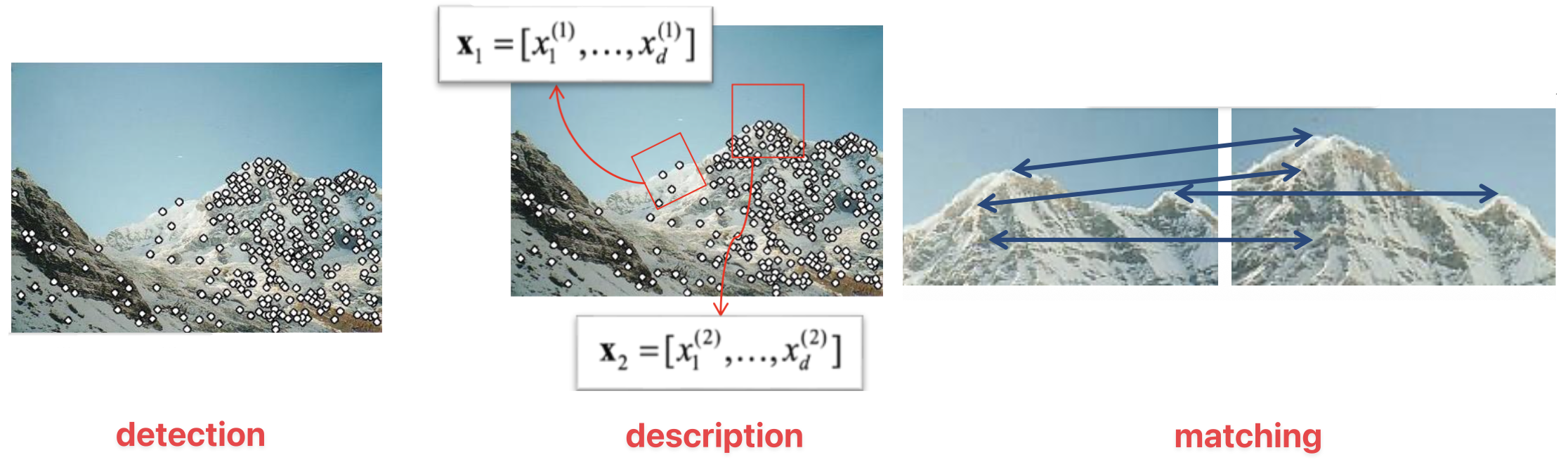 2. 描述(description):围绕每个兴趣点,提取向量特征描述符 (descriptor)