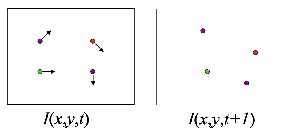 • 亮度持续性(brightness constancy):相同点在每一帧上看起来应当是相同的