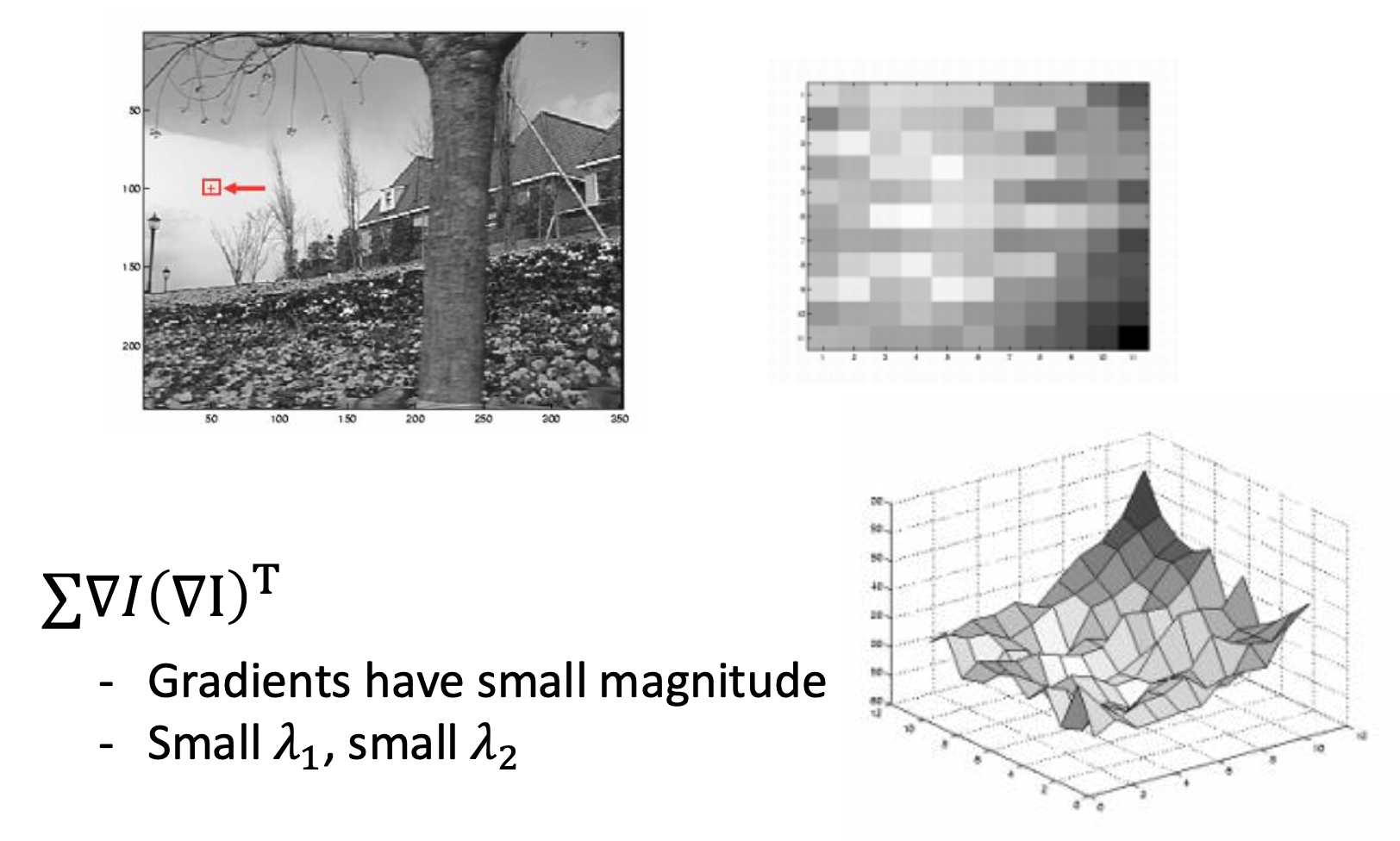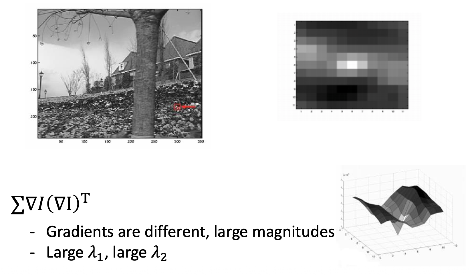 \[ H=\sum_{(u,v)}w(u,v)\begin{bmatrix}I_x^2&I_xI_y\\I_xI_y&I_y^2\end{bmatrix}\quad I_x=\frac{\partial f}{\partial x},I_y=\frac{\partial f}{\partial y} \]