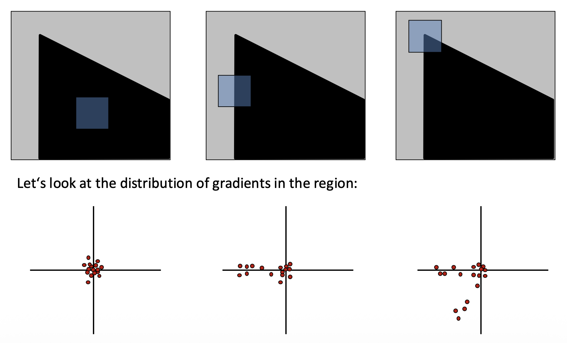 • 平滑(flat) 区域:沿任意方向都不会改变