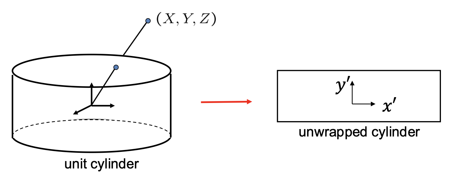 其中 \((x', y')\) 为圆柱坐标,\((x, y)\) 为图像坐标(原点位于图像中心\(r\) 是圆柱半径,\(f\) 是焦距。