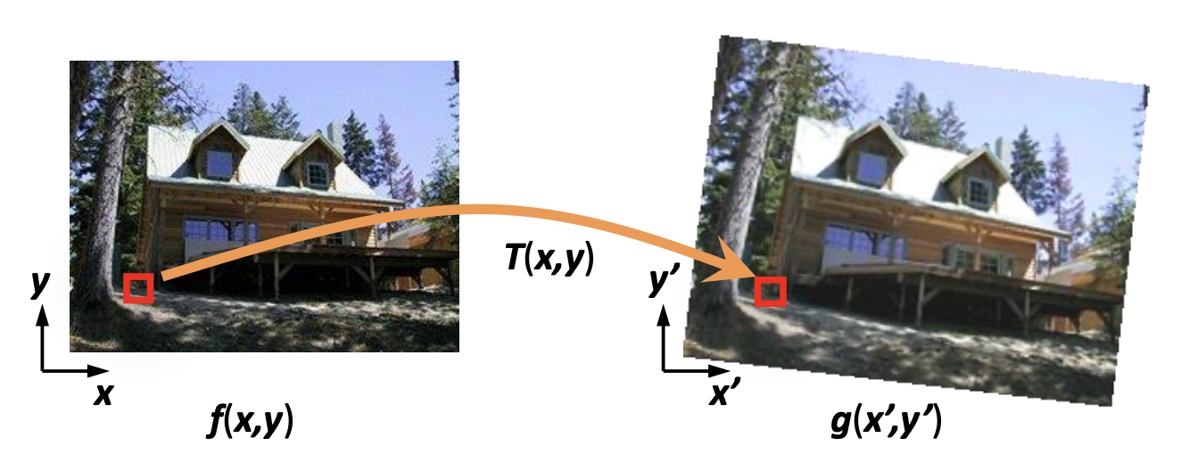 • 前向扭曲(forward warping):将 \(f(x, y)\) 的每个像素发送至对应在 \(g(x', y')\) 上的位置 \((x', y') = T(x, y)\)