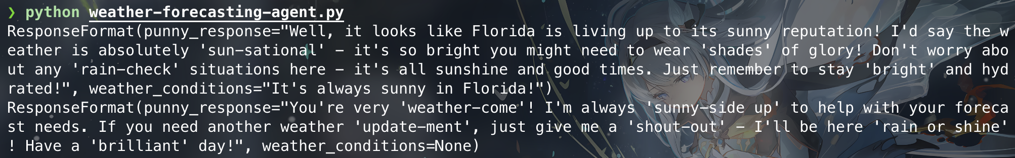agent = create_agent( model=model, system_prompt=SYSTEM_PROMPT, tools=[get_user_location, get_weather_for_location], context_schema=Context, response_format=ResponseFormat, checkpointer=checkpointer ) # `thread_id` is a unique identifier for a given conversation. config = {"configurable": {"thread_id": "1"}} response = agent.invoke( {"messages": [{"role": "user", "content": "what is the weather outside?"}]}, config=config, context=Context(user_id="1") ) print(response['structured_response']) # ResponseFormat( # punny_response="Florida is still having a 'sun-derful' day! The sunshine is playing 'ray-dio' hits all day long! I'd say it's the perfect weather for some 'solar-bration'! If you were hoping for rain, I'm afraid that idea is all 'washed up' - the forecast remains 'clear-ly' brilliant!", # weather_conditions="It's always sunny in Florida!" # ) # Note that we can continue the conversation using the same `thread_id`. response = agent.invoke( {"messages": [{"role": "user", "content": "thank you!"}]}, config=config, context=Context(user_id="1") ) print(response['structured_response']) # ResponseFormat( # punny_response="You're 'thund-erfully' welcome! It's always a 'breeze' to help you stay 'current' with the weather. I'm just 'cloud'-ing around waiting to 'shower' you with more forecasts whenever you need them. Have a 'sun-sational' day in the Florida sunshine!", # weather_conditions=None # )
