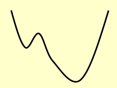还是用那个碗类比,对应的碗的剖面大概长这样(边上有一小块凹下去的地方,使算法误以为这个局部最优无法得到进一步提升,视其为全局最优,从而得到错误的结果