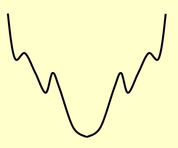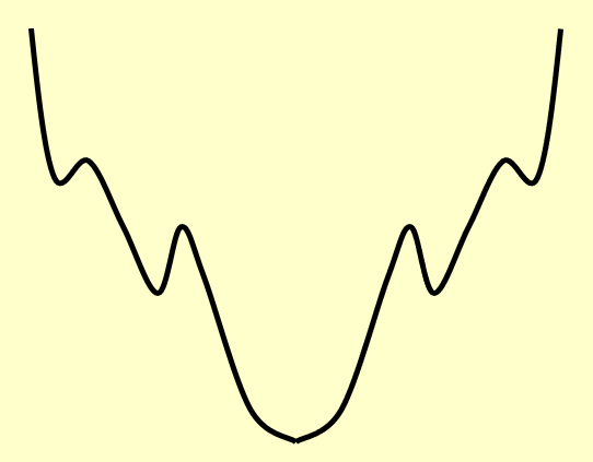 因此这种情况更为棘手。继续用碗来类比,对应的碗的剖面大概长这样(这个碗有很多“坑点”,算法很容易会掉入其中的一个“坑”里无法爬出来