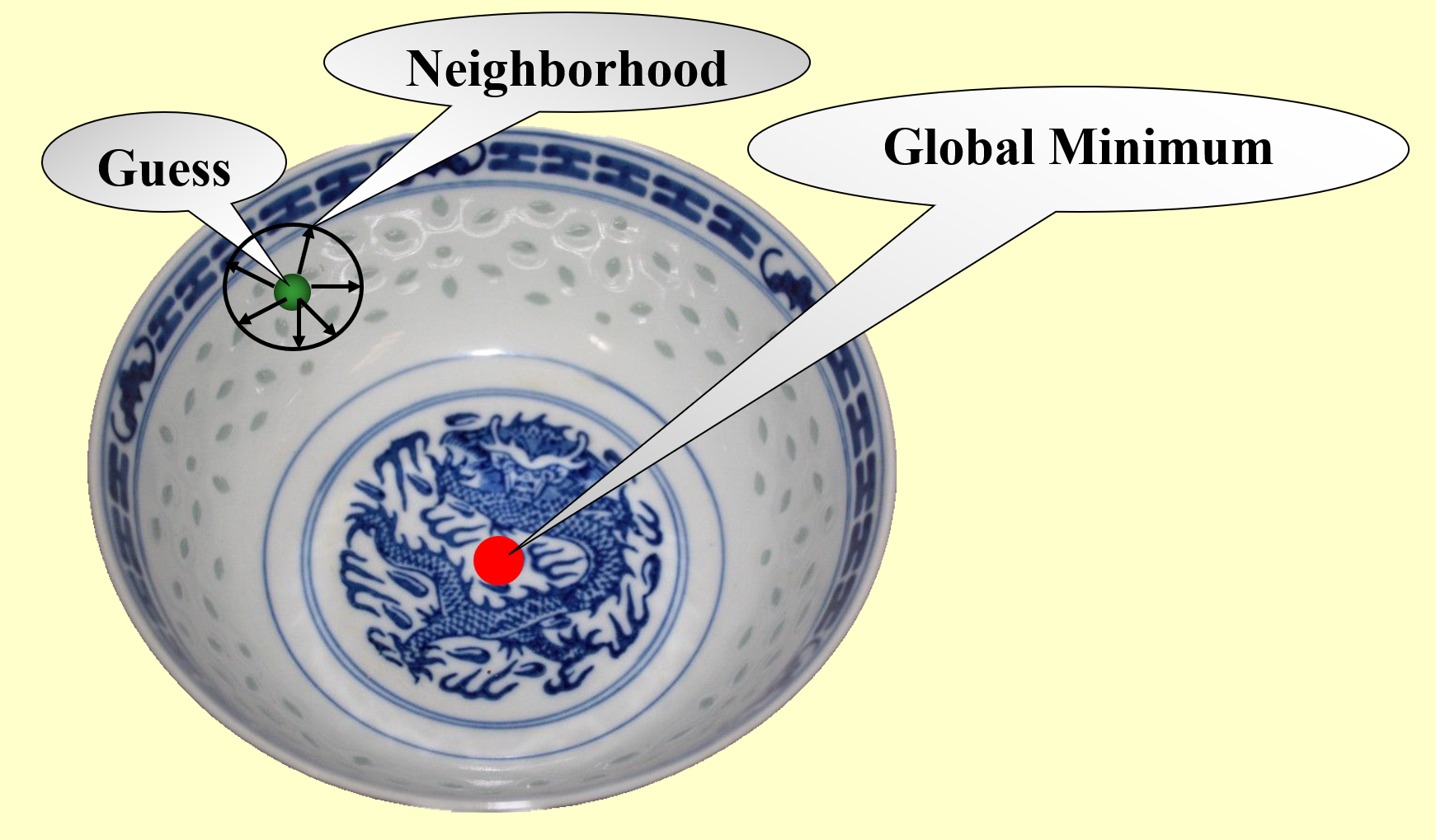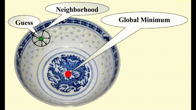 • 以该点为中心,在一定范围内(邻居 (neighbor))搜寻该范围内的最低点(局部最优解)