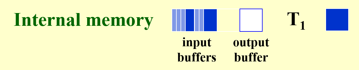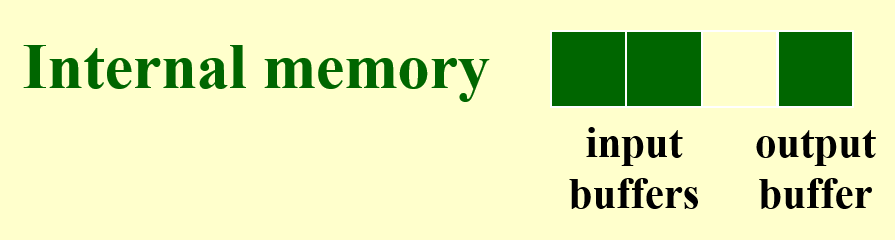 - 解决方案是借鉴输出缓存的做法,对于 k 路归并排序,我们将输入缓存划分为2k个子空间(同样不用增加额外的空间