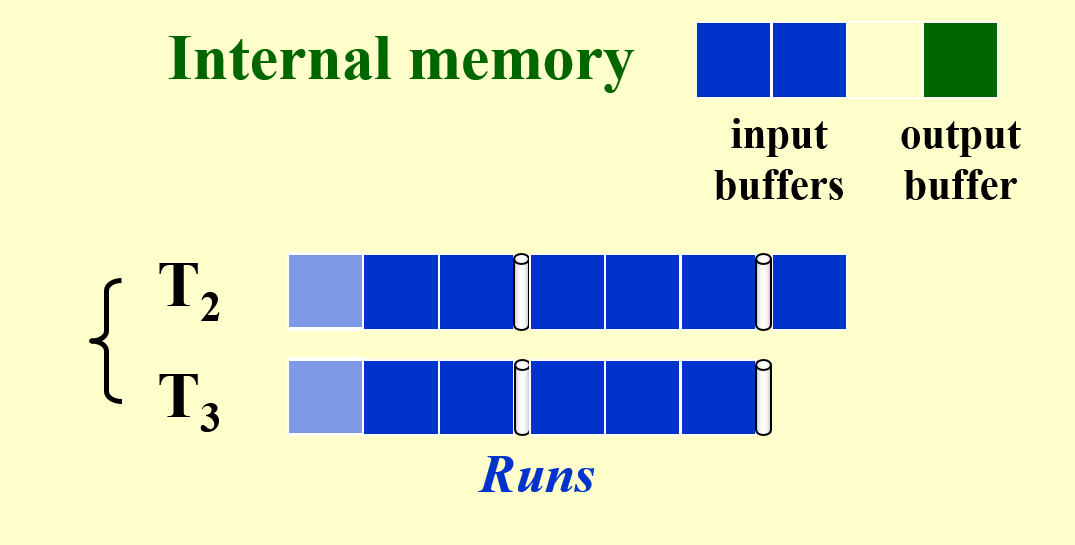 ! )。其中的 k 个子空间用于容纳正在进行排序的记录,而另外 k 个子空间用于读取子序列的记录块,这样的话一半空间的记录排完后,可以紧接着对另一半的记录进行排序,不会被读取给耽搁了 ~ - \(k \uparrow\ \Rightarrow \text{number of input buffers} \uparrow\ \Rightarrow \text{buffer size} \downarrow\ \Rightarrow \text{block size on disk} \downarrow\ \Rightarrow \text{seek time} \uparrow\)(即 I/O 时间的增加