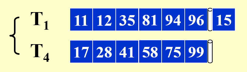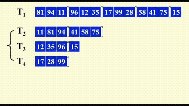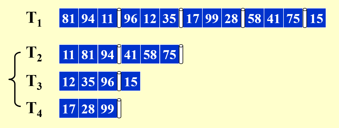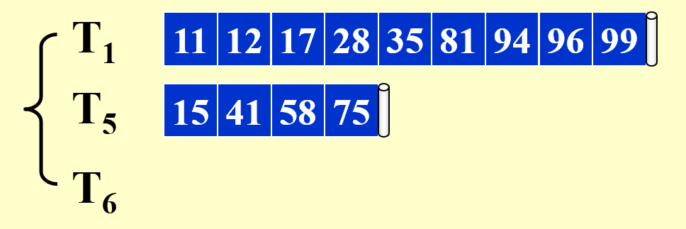 - 因此,对于 \(k\) 路归并排序,只需要 \(k+1\) 个磁带就够了
