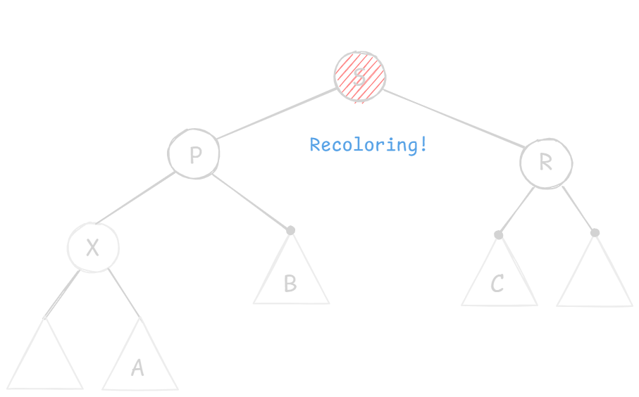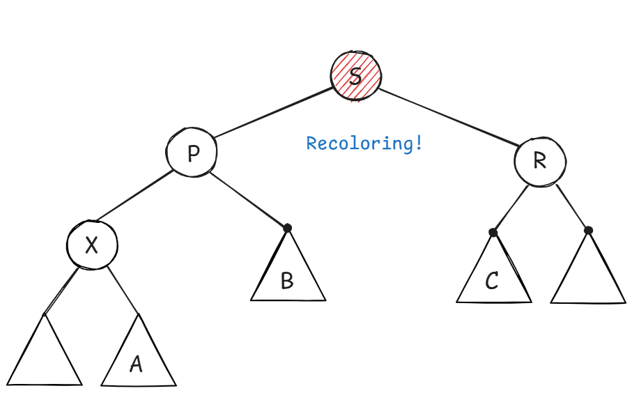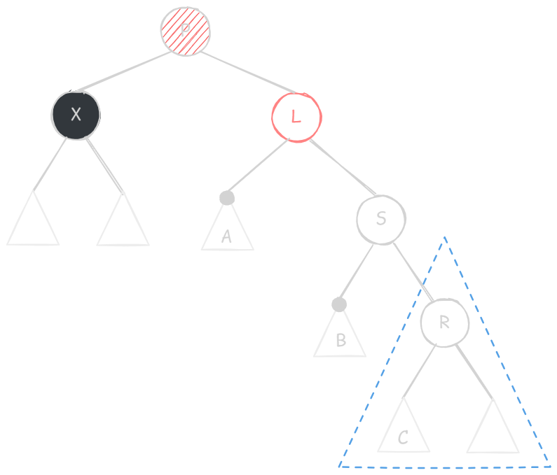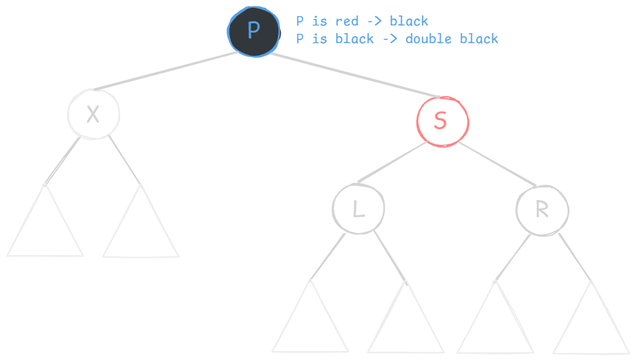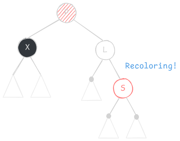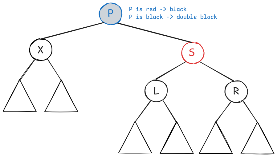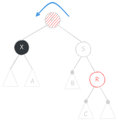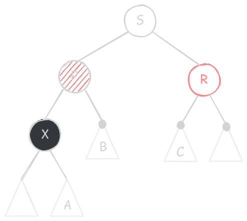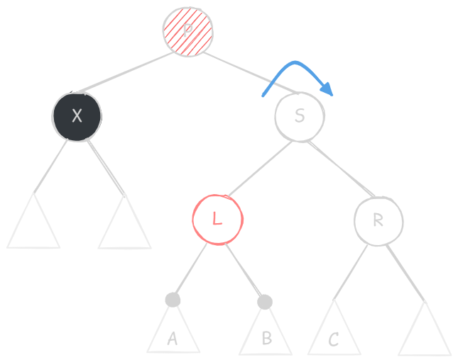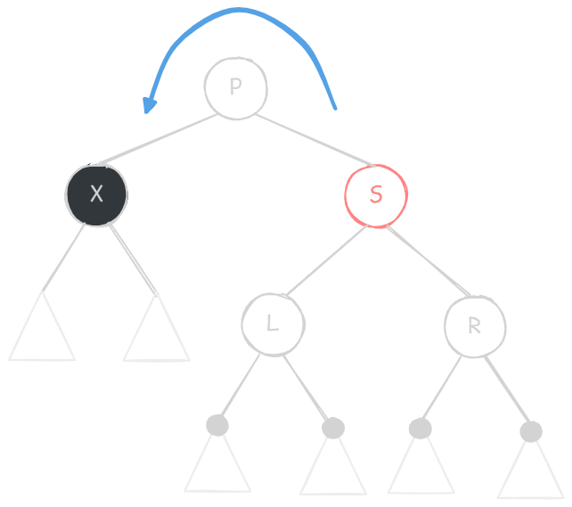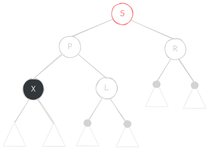 X 的兄弟节点 S 是红色的(则 S 的两个孩子、父节点 P 一定都是黑色的