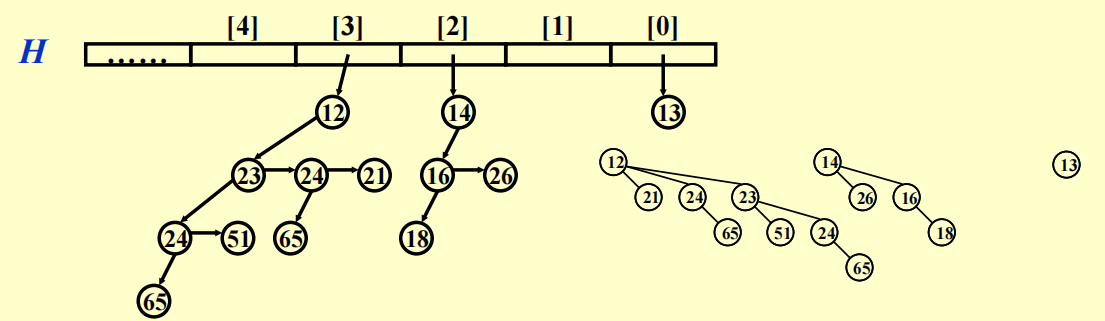 快速找到所有的子树 | 将所有子树的根节点存在数组中(索引为树高) 并且使用Left-child-next-sibling(链表)方法维护二项树 |