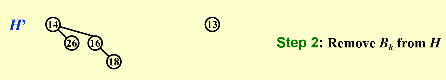 FindMin操作(找到最小值)\(\Rightarrow\ O(\log N)\) - 假设在 \(B_k\) 中找到最小值,那么将 \(B_k\) 从二项堆 \(H\) 中移除,剩下的二项堆记作 \(H'\) \(\Rightarrow\ O(1)\)