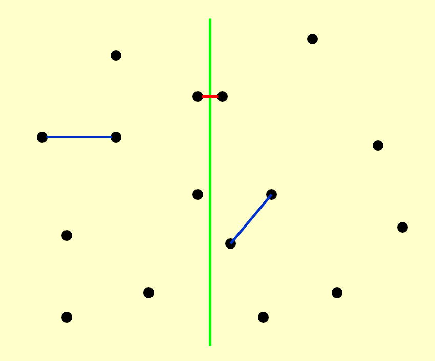 ) ,在上图分别为红色的四个点和绿色的四个点。 - 因此,即使所有的点都在垂直 \(\delta\) 带内,因为每个点的判断是常数次的,因此中间情况的时间复杂度就是 \(O(N)\) 了