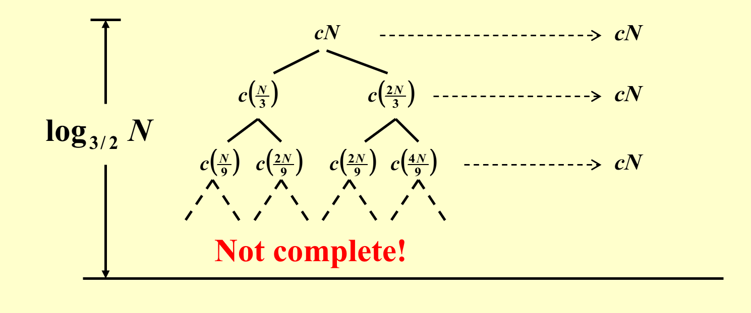 已知 \(T(N) = T(\dfrac{N}{3}) + T(\dfrac{2N}{3}) + cN\),求 \(T(N)\)。