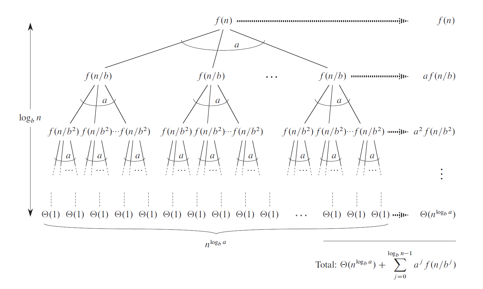 那么这棵树的节点之和为:\(T(N) = \Theta(N^{log_b a}) + \sum\limits_{j = 0}^{\log_b N - 1}a^j f(\dfrac{N}{b^j})\)