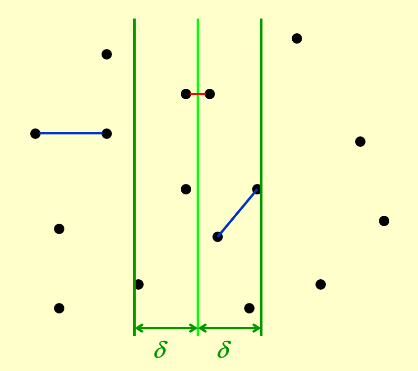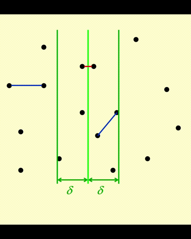 一种可行的改进方法是:仅考虑距分隔线水平距离为 \(\delta\) 内的点,其中 \(\delta\) 是我们提前选定的常数。现在,我们得到了一个位于中间部分,且宽度为 \(2\delta\) 的区域,称为 \(\delta\) 带 (\(\delta\)-strip)。这个区域之外的点显然不会是最近点对的可能点