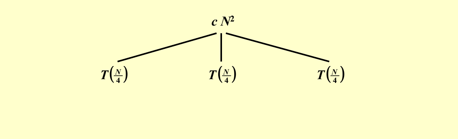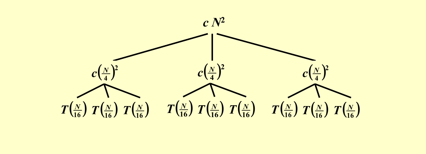 - 由以上两条信息,可以推得最后一层的节点(全是 \(T(1)\))之和为 \(3^{\log_4 N} = N^{\log_4 3} = \Theta(N^{\log_4 3})\)