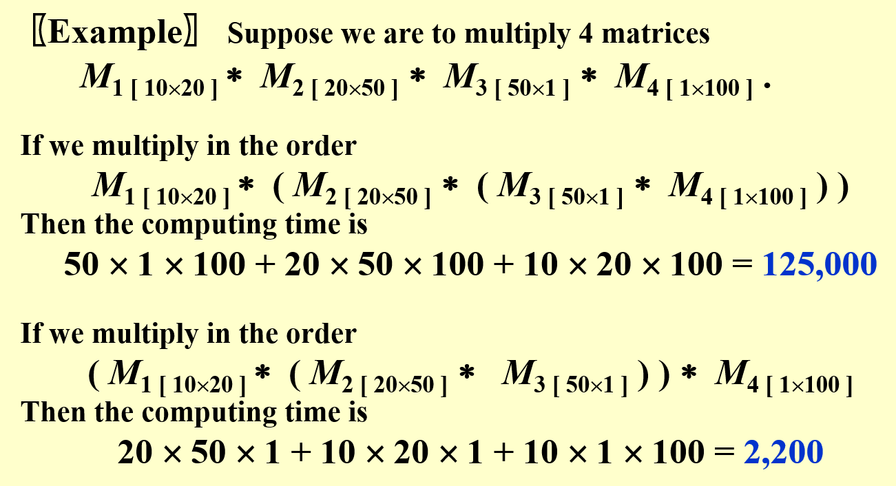 对于多个矩阵的乘法,乘法的顺序相当关键,如果顺序选择不当,会让计算次数变得相当多。