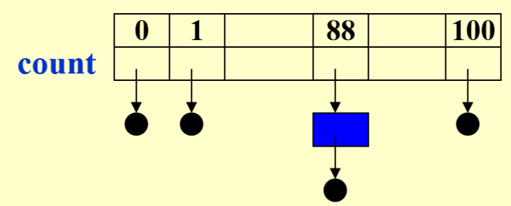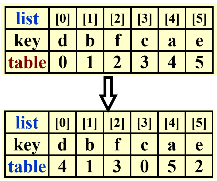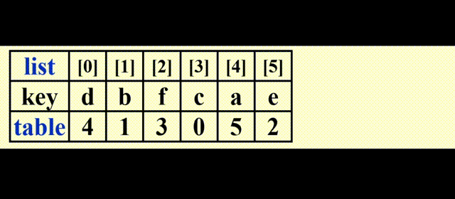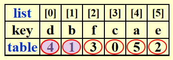 table[]数组存储指针。注意这里的指针不是 C 语言的指针类型,而是数组list[]的索引。初始化为table[i] = i - 对