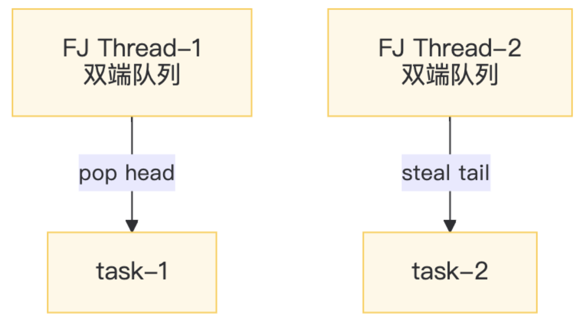 ForkJoinPool的核心思想是递归地 fork(拆分)任务和 join(合并)结果,每个工作线程都维护一个双端队列(deque) 存放任务- 线程在自己的队列头部(top)取出任务执行,当自己的任务做完后,会去偷取其他线程队列尾部(base)的任务来执行(这就是工作窃取)
