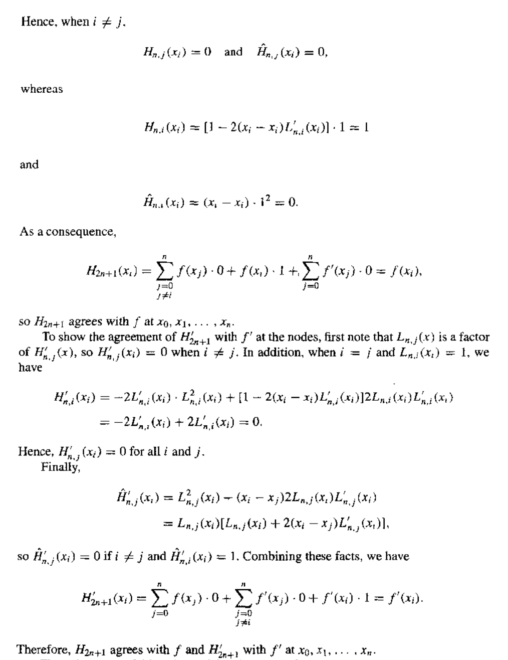 其中 \(H_{n,j} = [1 - 2(x - x_j) L'_{n,j}(x_j)]L_{n,j}^2(x)\),\(\widehat{H}_{n,j}(x) = (x - x_j) L^2_{n,j}(x)\)。在这里,\(L_{n,j}(x)\) 指代的是 \(n\) 阶多项式中第 \(j\) 个拉格朗日系数。