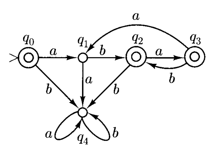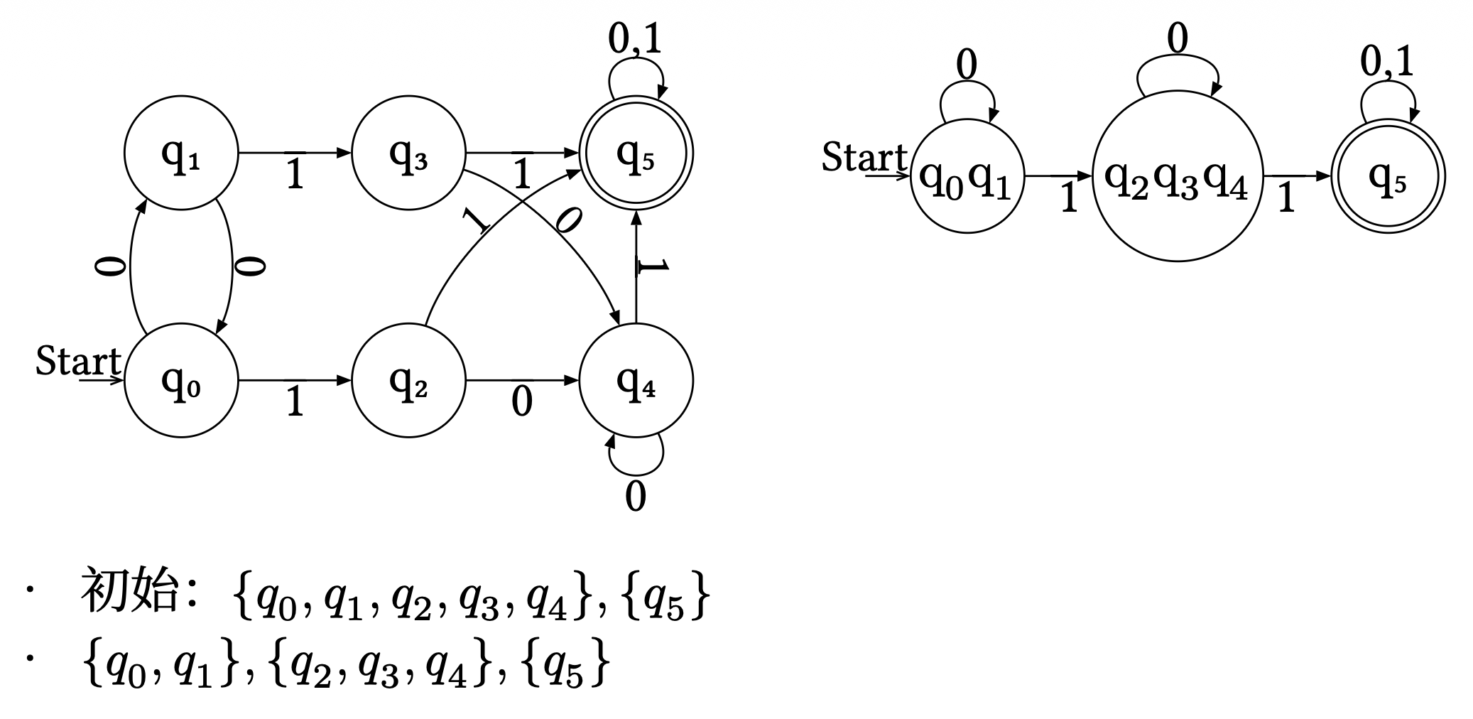 可以看到,如果出现连续 3 个 \(b\) 的情况,状态机就会陷入(trap) \(q_3\) 这唯一的非最终状态,因而该字符串无法为自动机接受。我们称 \(q_3\) 为死亡状态(dead state)。DFA 最小化 (minimization)(来自朋辈辅学)