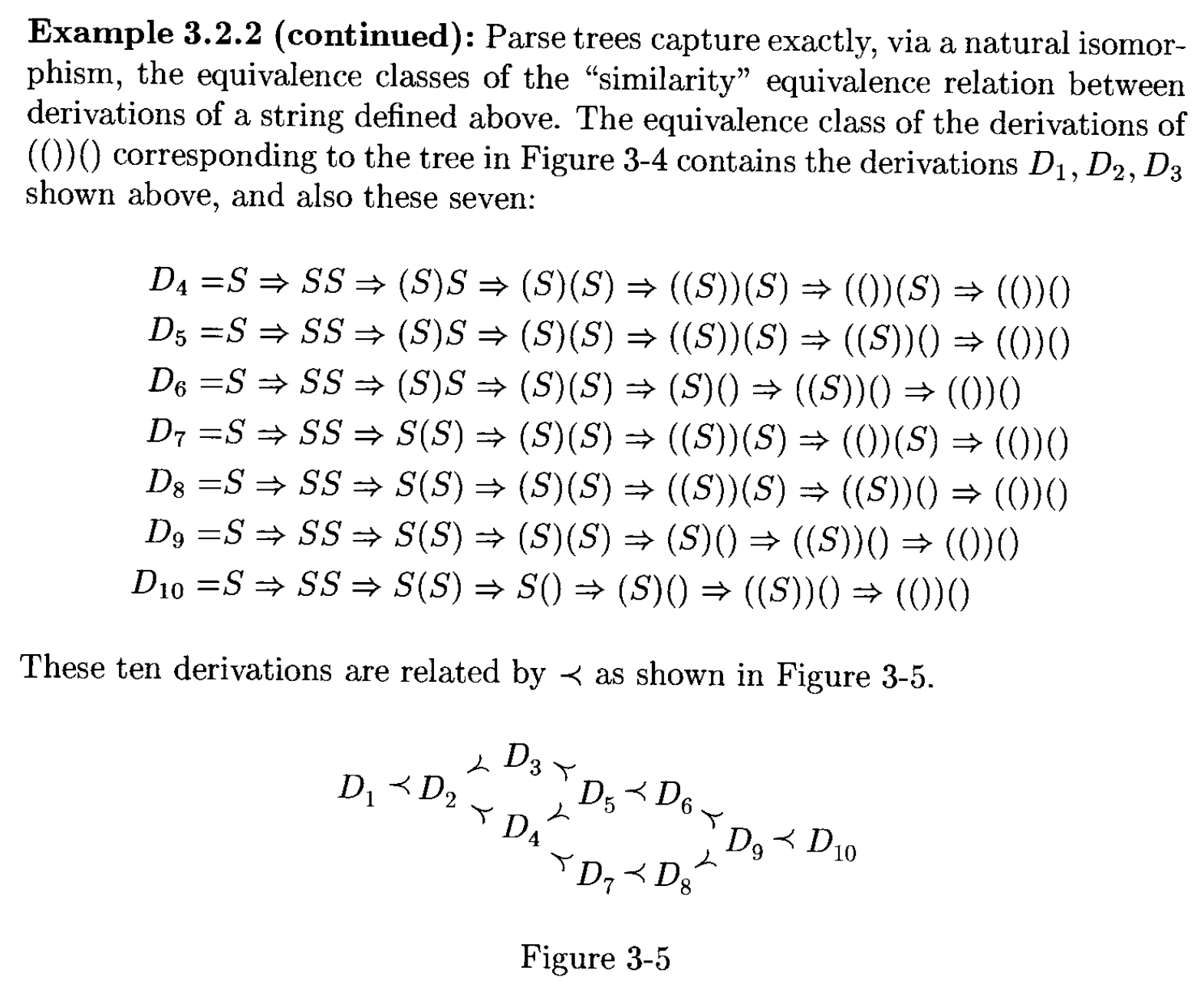 \((D, D')\) 属于 \(\prec\) 的自反、对称、传递闭包时,称 \(D, D'\) 相似的(similar)。说人话就是:如果其中一个推导能够通过“交换(switching)”使用规则的顺序来得到另一个推导,那么这两个推导就是相似的。