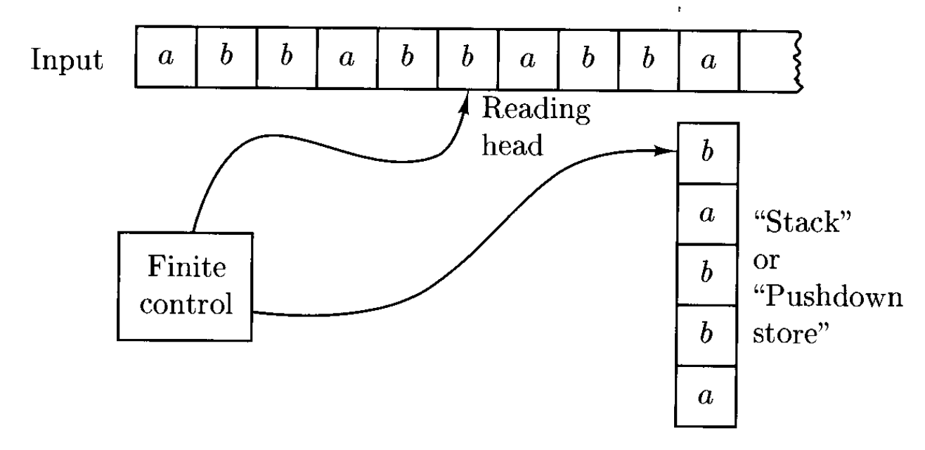 并不是所有 CFL 都能被 FA 识别,因为 CFL 不一定是正则的。比如考虑这个例子:\(\{ww^R: w \in \{a, b\}^*\}\),它是上下文无关的,但是无法用 FA 表示。然而,如果机器能够在读取时积累输入字符串,每次向已存储的字符串附加一个符号,那么机器就能以非确定的方式猜测出何时到达输入的中心,从而每次能检查内存中的符号。这样的存储设备是一个(stack),因为只允许读取和写入顶部的符号。