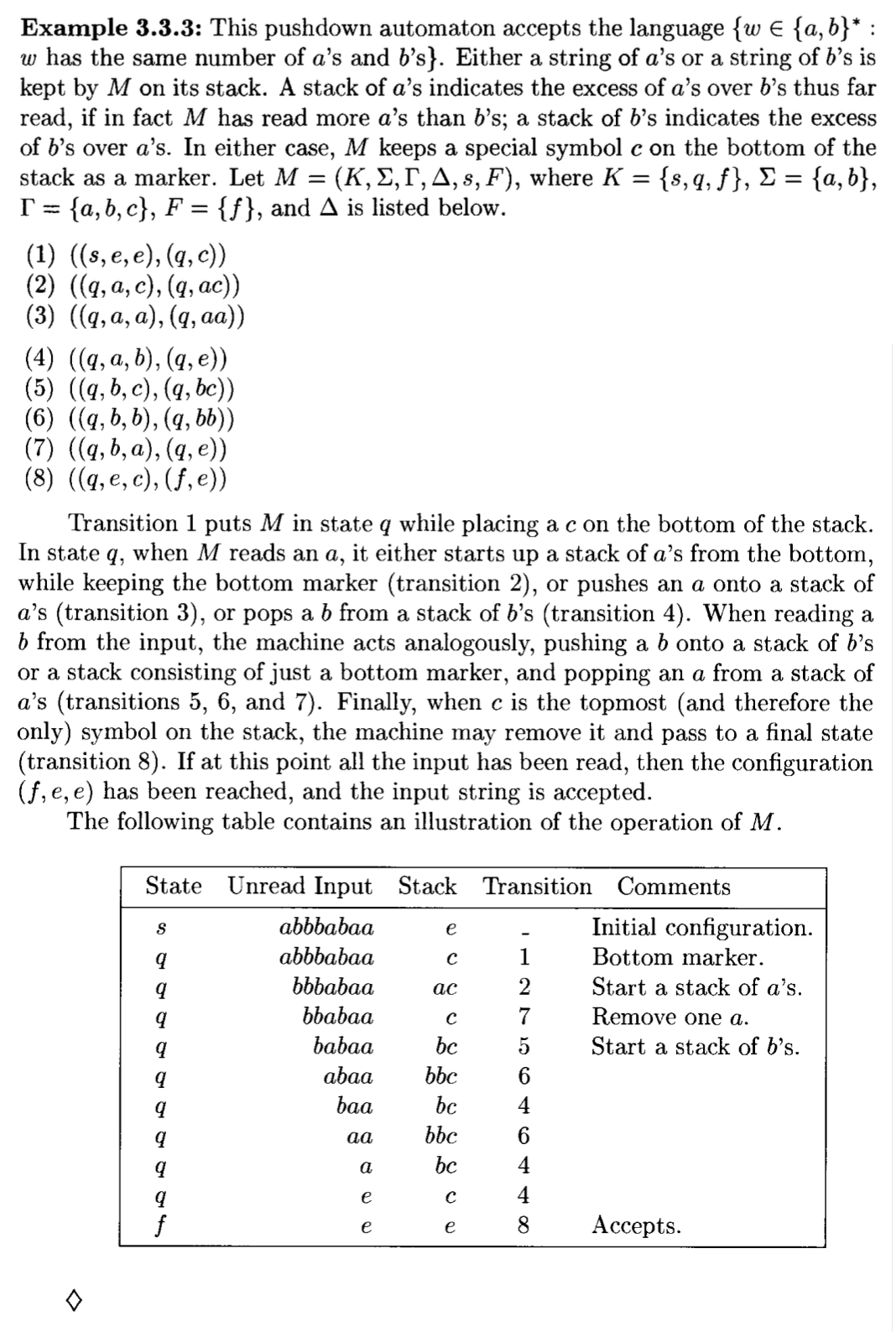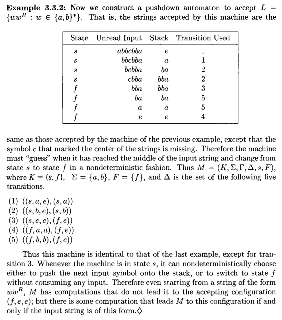 • 直观地,若 \(((p, a, \beta), (q, \gamma)) \in \Delta\),那么处在状态 \(p\) 且栈的顶层符号为 \(\beta\) 的自动机 \(M\) 可能会从输入纸带中读取 \(a\)(若 \(a = e\) 就是没有读到任何东西,用 \(\gamma\) 替换栈上的 \(\beta\),并进入状态 \(q\)。这样的一个配对就是 \(M\) 的一个转移(transition)。