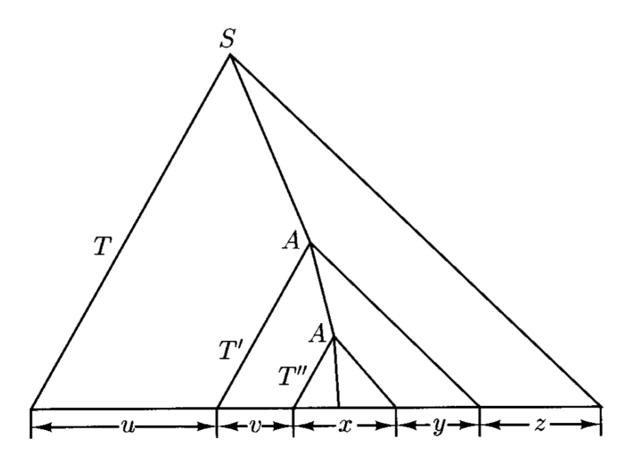 • \(T'\) 中除去 \(T''\) 的部分能够被重复任意多次(包括 0 ,以产生其他解析树,对应产出为 \(uv^nxy^nz\)