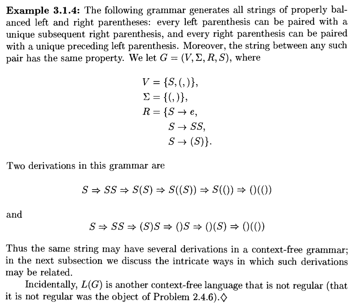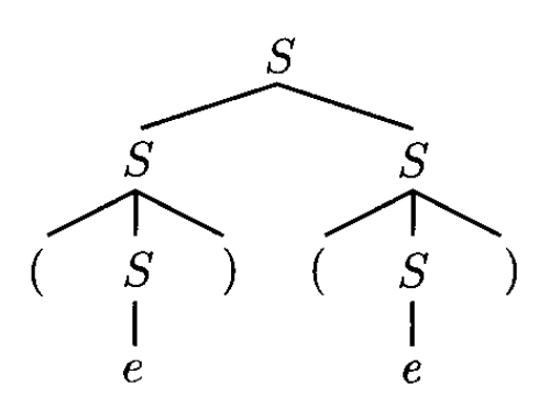 根据上一节例 2 给出的 CFG,对于字符串 \(()()\),可以通过两种截然不同的推导得到: