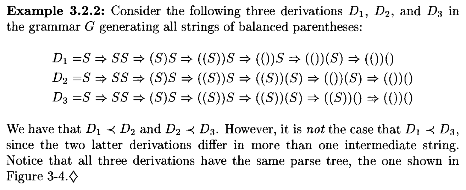 解析树能够表示推导的等价类(equivalence classes)。令 \(G = (V, \Sigma, R, S)\) CFG\(D = x_1 \Rightarrow x_2 \Rightarrow \dots \Rightarrow x_n, D' = x_1' \Rightarrow x_2' \Rightarrow \dots \Rightarrow x_n'\) \(G\) 的两个推导,其中 \(x_i, x_i' \in V^*\ (i = 1, \dots, n);\ x_1, x_1' \in V - \Sigma;\ x_n, x_n' \in \Sigma^*\)。当 \(n > 2\) 且存在整数 \(k\)\(1 < k < n\),满足: