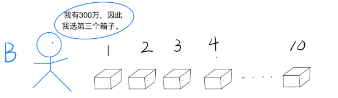 请第二个百万富翁来,让他选择自己财产数额对应的箱子(在第一个百万富翁不参与的情况下